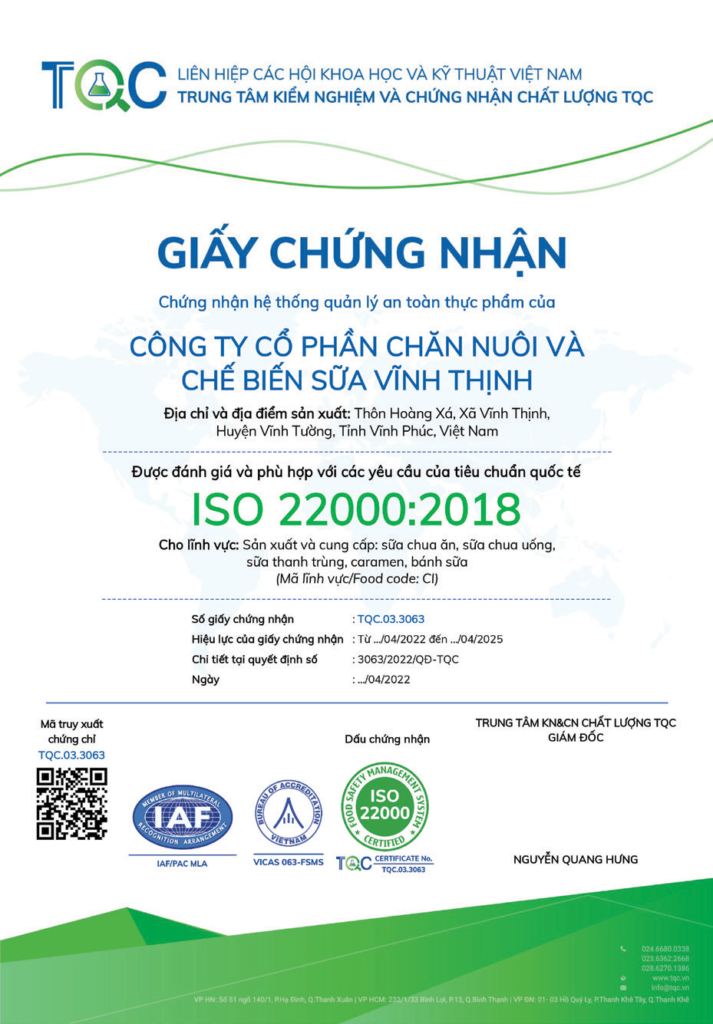Công Ty Cổ Phần Chăn Nuôi Và Chế Biến Sữa Vĩnh Thịnh đã và đang thực hiện các hoạt động sản xuất theo quy trình khép kín nhằm đảm bảo chất lượng đạt chuẩn ATTP. Quy trình quản lý chất lượng được thực hiện theo tiêu chuẩn ISO 22000:2018.